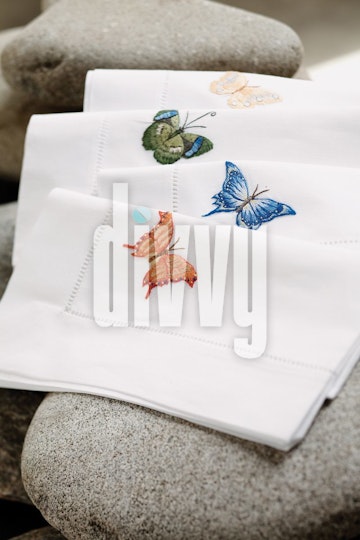 A set of cloth napkins with butterflies embroidered on them rests on a smooth stones.