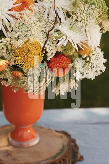 Orange vase filled with an autumnal floral arrangement is displayed on a wood slice.