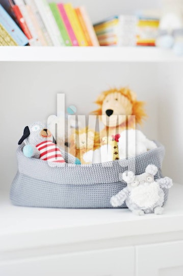 A group of stuffed animals are gathered in a gray basket on a bookshelf.