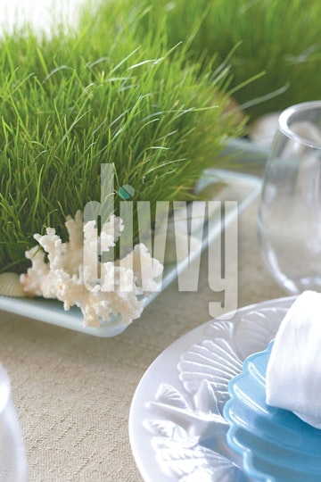 Grass, coral and seashells arranged as centerpieces on top of beige tablecloth near glass, white seashell plate and blue scalloped plate.