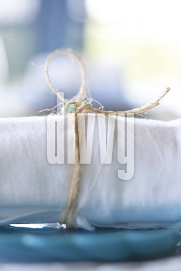 A detail shot of a rolled white napkin tied with twine arranged on a blue plate.