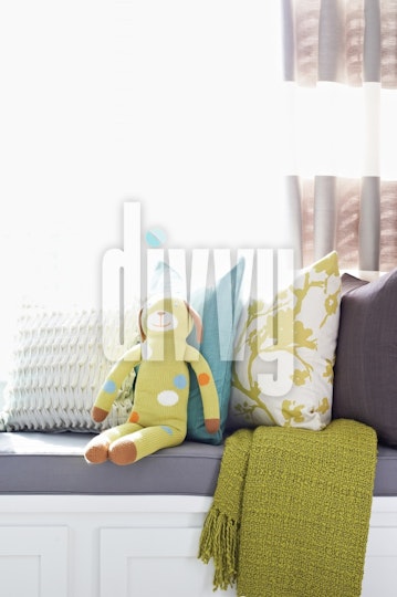 A stuffed dog is propped on colorful pillows arranged on a bench in a baby's nursery.