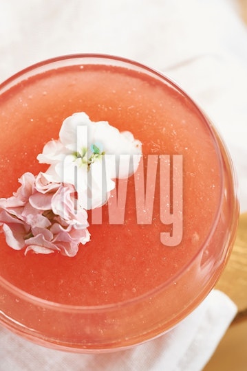 A slushy orange punch in a punch bowl is decorated with flower blossoms.