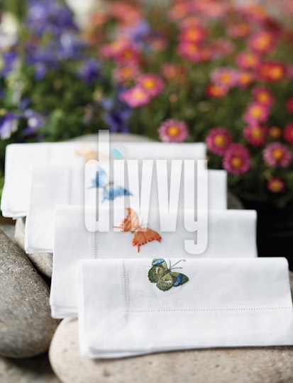 A set of four cloth napkins embroidered with butterflies rest on smooth garden stones.