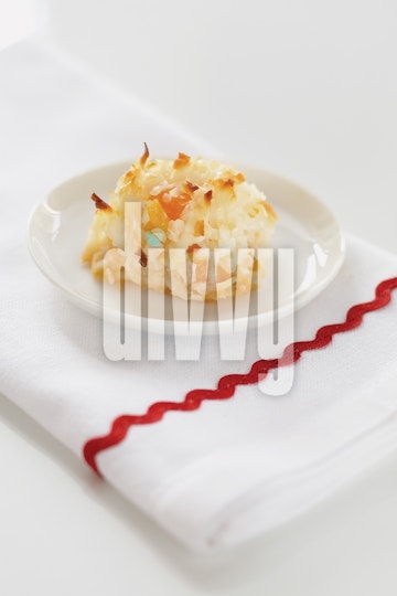 A single apricot macaroon rests on a small plate sitting on a cloth napkin.