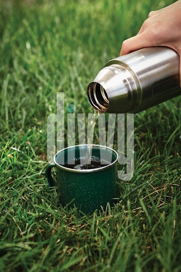 A man pours hot apple cider from a Thermos into a mug sitting in grass.