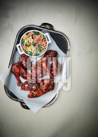 Saucy BBQ chicken pieces are served on parchment paper in a metal platter next to a veggie salad in a white ramekin.