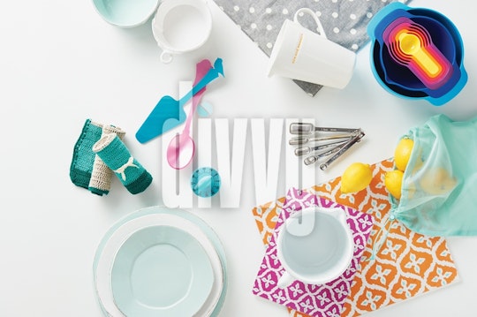 Lemons, measuring cups, measuring spoons, plates, kitchen timer, dish cloths, spatula, pie server, cups and napkins arranged on white surface.