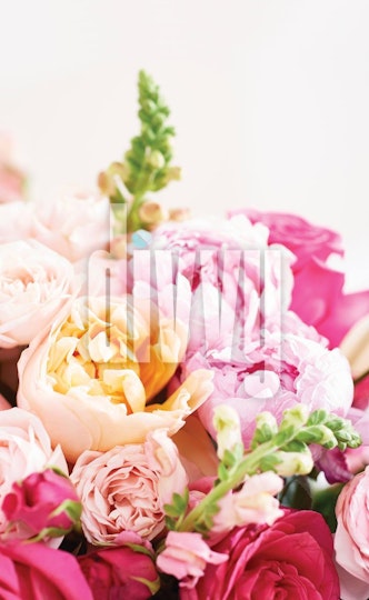 One yellow cabbage rose in a bouquet of varying shades of pink cabbage roses on a light pink background.