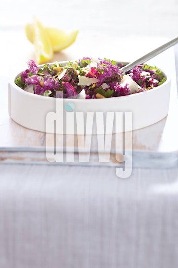 A lemon-garlic purple kale salad is topped with toasted pine nuts and shaved Pecorino Romano cheese.