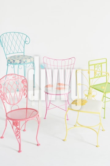 Colorful metal outdoor chairs and cushions are arranged on a white background