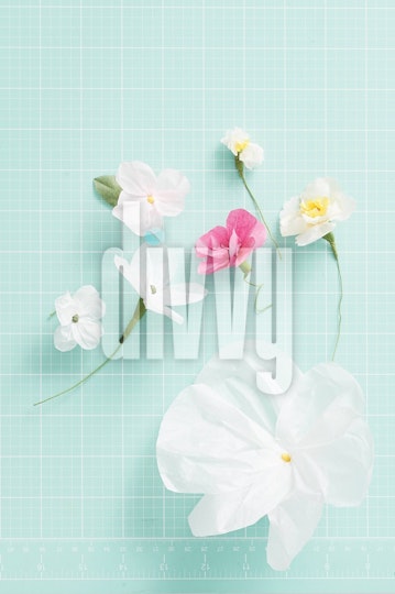 Handmade tissue paper flowers rest on an aqua blue cutting mat