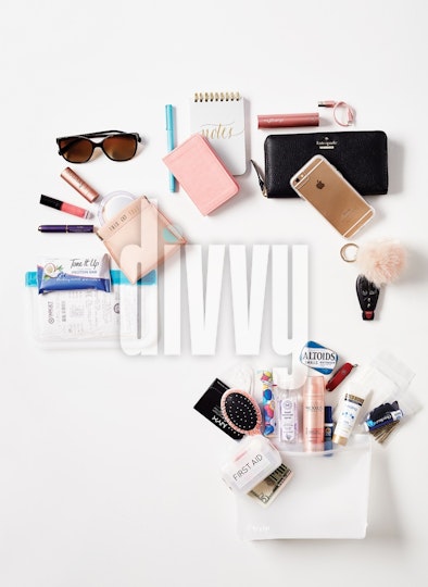 An overhead shot of the contents of a purse or handbag, including a wallet, makeup, sunglasses, cell phone and first aid items.