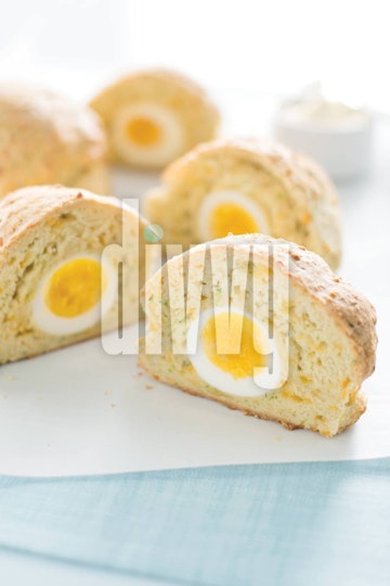 A twist on Scotch eggs, hard-boiled eggs are baked inside flaky cheddar biscuits.