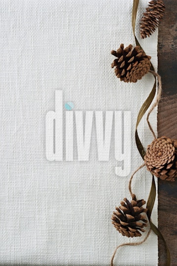A simple white woven cotton cloth sits on a wooden table with pinecones, twine and raffia along one of the borders.