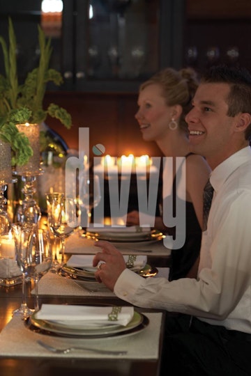 A man and a woman in fancy dress sit at a dinner party table lit by candlelight.