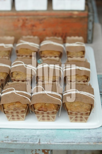 Tiny loaves of homemade Banana Walnut Bread are served on the dessert table at an outdoor fall party.