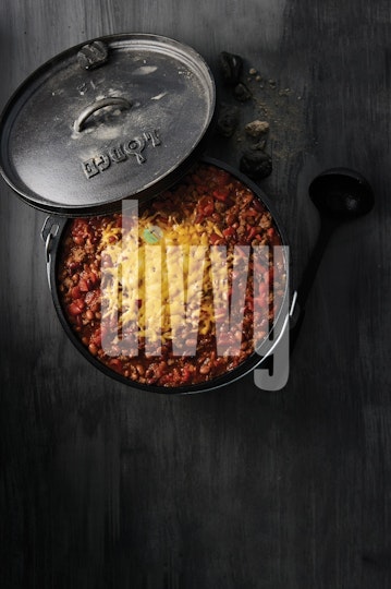 Cowboy chili cooked over a fire in a cast iron pot is shown on a gray wood surface with ashy coals.