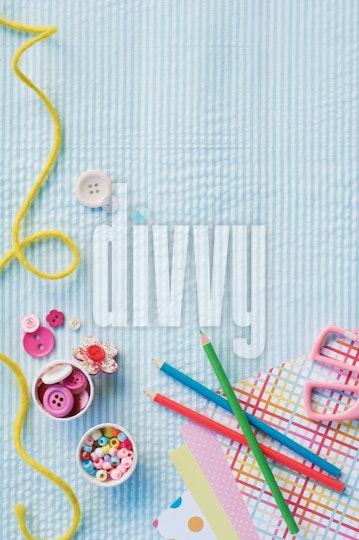 Colorful kids' craft supplies—buttons, beads, pencils, patterned papers and scissors—are collected on a blue striped fabric background.