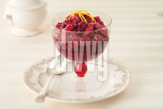 Chunky cranberry-raspberry relish is garnished with orange zest and served in a glass goblet sitting on a white plate with silver details.