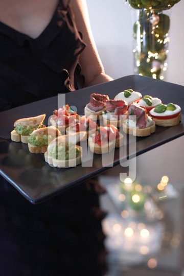 A woman in a black dress holds a black serving tray with an assortment of crostini appetizers.