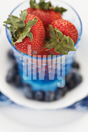 A blue glass filled with strawberries is served on a plate surrounded by blueberries.