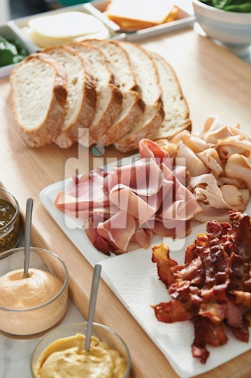 Cutting board filled with ham, turkey, bacon, bread and cheese for sandwich making.