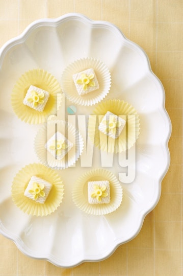 A scalloped white dish holds six petit fours decorated with iced daffodils.