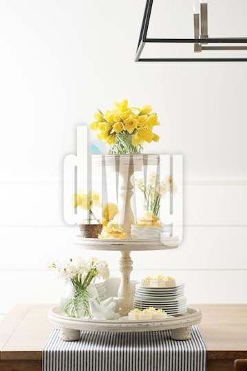 A white wood tower is filled with vases of daffodils and paperwhite narcissus flowers, cupcakes and petit fours for a spring party.