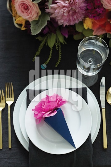 A handmade favor box tops a formal black and white place setting with gold flatware, next to a floral arrangement.