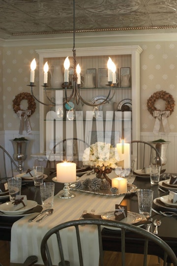A holiday table set in a palette of brown, silver and white is lit by candlelight in a neutral-toned dining room with a pressed tin ceiling and simple chandelier.