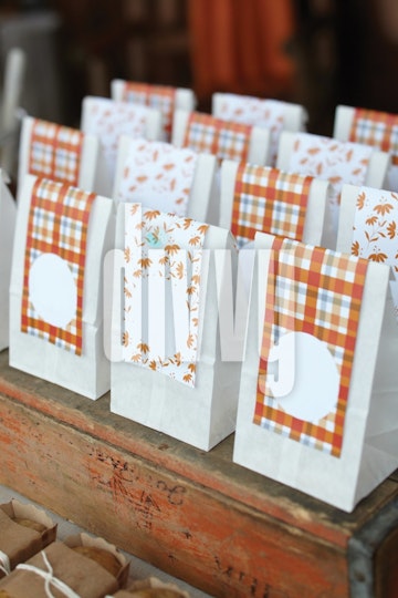 White paper bags are decorated with orange patterned paper and sit on a wood table at an outdoor fall party.
