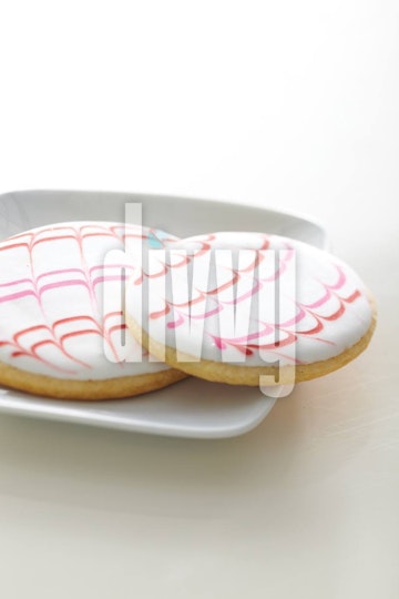 Two white-iced sugar cookies are decorated with red and pink swirls.