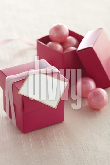 Homemade decorative boxes are filled with pink candy balls as a gift.