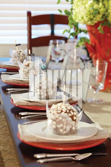 Carmel apples covered in white chocolate chips and peppermint pieces used as table settings.