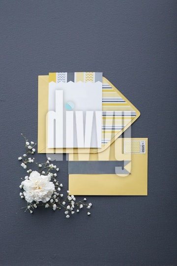A blank decorative card rests on a matching envelope with white flowers