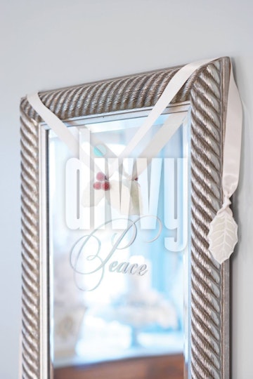 Silver decorative mirror with peace etching and white mistletoe draped on top.