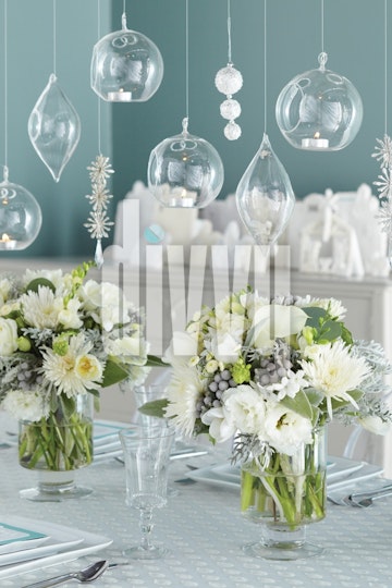 Holiday table decorated with two vases filled with an assortment of white flowers, and hanging glassware holding tea lights.