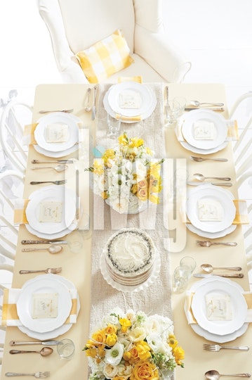 A table is set with place cards and yellow and white floral arrangements for a spring-themed brunch party.