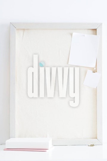 A white-paper-covered cork board has notes pinned on it and books at its base.