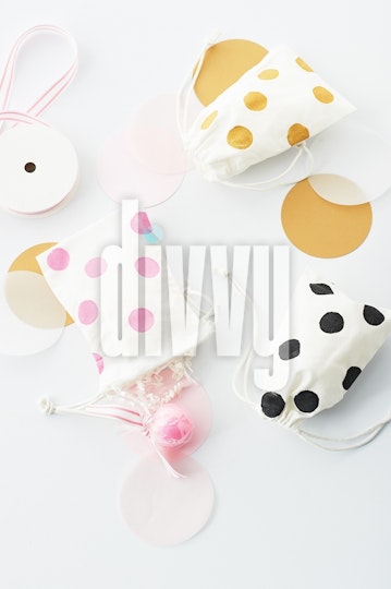 Hand-stamped polka dot drawstring party favor bags sit on a white table with party decorations.