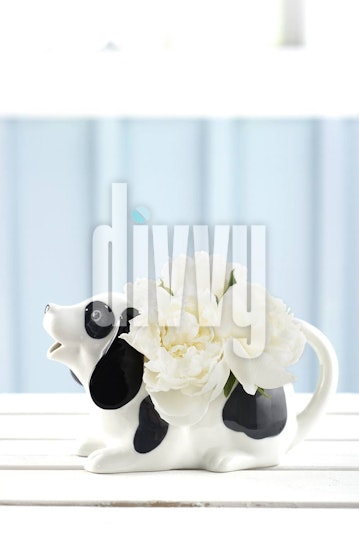 White flowers fill a vintage black and white dog cream pitcher on a rustic white table.