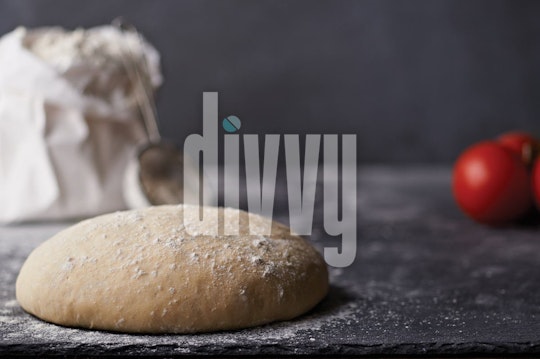 A ball of dough rises as it sits on a slate surface with flour and tomatoes.