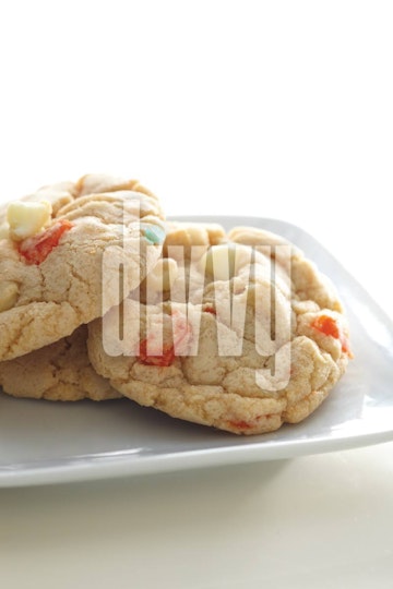 Pieces of dried tropical fruit and white chocolate chips peek out of macadamia nut cookies served on a white plate.