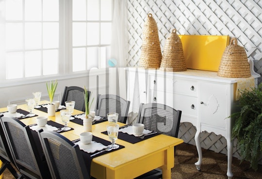 Black and gold table set for lunch. Wicker bee hives decorate a white cupboard behind the table.
