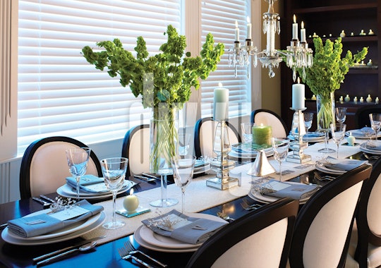 Elegant table set with monogrammed grey napkins, crystal decor, candles and tall green centerpieces.