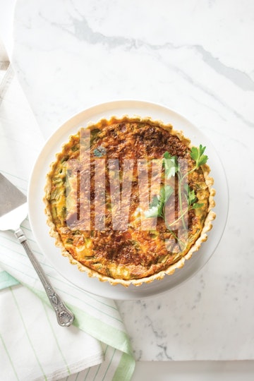 A quiche Lorraine made with bacon and green onions is garnished with fresh parsley and rests on a marble countertop before being served.