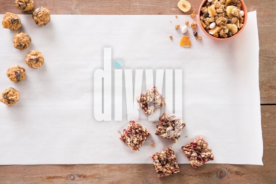Three different kinds of homemade energy snacks—fruit & nut energy balls, multigrain strawberry bars and honey-roasted granola trail mix—are arranged on paper on top of a picnic table.