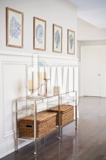 A glass console table with candles and wood baskets displayed in front of wainscoting under coastal wall art.