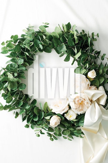 A wire-frame wreath made with eucalyptus and is embellished with faux peonies, white roses and a satin bow.